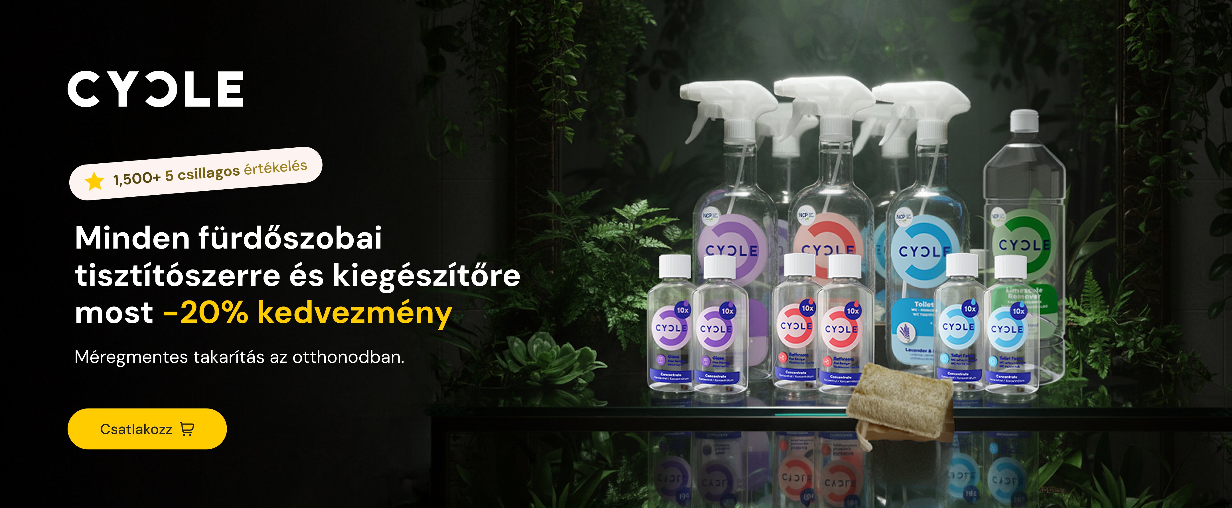 Koncentrátumainkkal akár 90%-kal is csökkentheted a műanyagfelhasználást, azáltal, hogy újratöltöd a használt tisztítószeres palackokat CYCLE koncentrátumokkal.